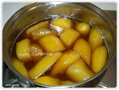 註:我買的黃地瓜,比較鬆軟,如果喜歡吃Q軟的,建議買水份較少的紅地瓜,煮起來會更Q。還有煮這個時,人要在火爐旁,因為是用糖在熬煮,要很小心,也要注意別被糖水燙到了,這可是比一般的滾水還要燙!
